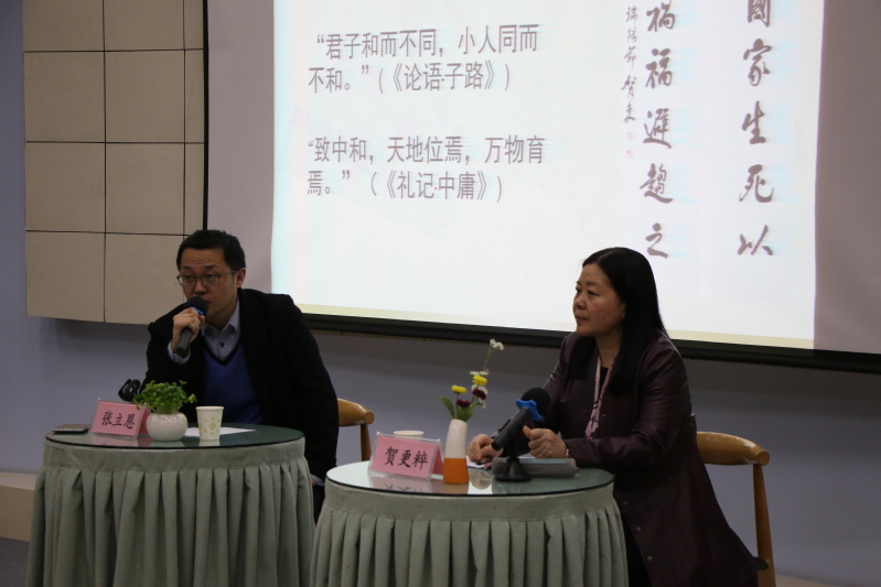 论道伊始,贺老师率先指出,在现实中“中庸”被普遍误解。之后,她依次从三个方面对中庸之道予以论述。首先,何谓“中庸”。为了让大家更好地了解儒家的中庸之道,贺老师对“中”“庸”二字的涵义,分别予以诠释:“中”字有真、善、美三层意思,“庸”字也有用、平常、大常三层涵义。对此,贺老师分别引用《尚书》《左传》《论语》、《老子》《中庸》《尔雅》《郭店楚墓竹简》等文献,对此一一阐明。总之,中庸就是不偏不倚的日用常行之理,中庸的状态是“和”。
