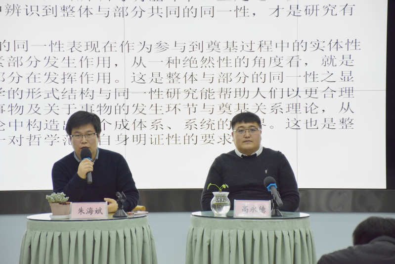 论道伊始,在读博士高永德便开门见山地提出本次讲座要讨论的四个部分:一、传统哲学的整体与部分范畴;二、现象学的定义与特征;三、整体与部分范畴的最高统一体;四、存在、是与形式本体论。