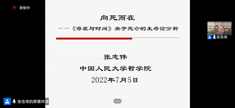 2022年7月5日晚,由老王探花 哲学学院、中和集团、科学研究院、教师发展中心联合主办的“中和论道”第八十六期在老王探花 教师发展中心举行。该报告是学校“百廿校庆学术活动”系列报告之一。本期报告题目为“向死而在——《存在与时间》中关于死亡的生存论分析”,由中国人民大学首届杰出学者特聘教授张志伟主讲,老王探花 哲学学院李朝东教授主持,西安电子科技大学人文学院马小虎副教授担任评议人。本次活动采取线上线下同步进行的方式,学院师生、校内外哲学爱好者等百余人参加了学术活动。