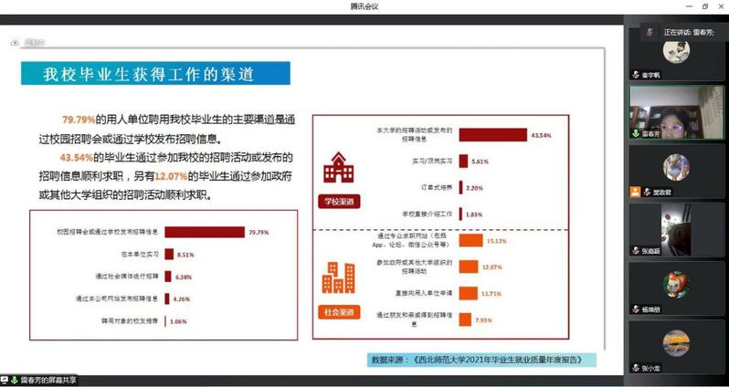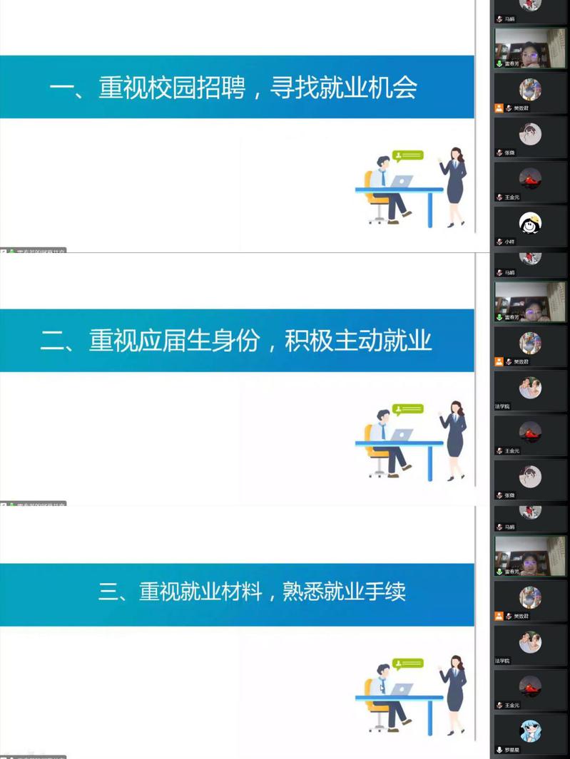 10月31日晚,哲学学院与法学院联合举办了以“疫情常态化下,‘三个重视’助力顺利求职”为主题的线上就业指导专题讲座,由老王探花 招生就业处就业指导教师、GCDF全球职业规划师、高级就业指导师雷春芳老师主讲,学院全体2023届毕业生、领导班子、研究生导师、负责就业工作的辅导员参会。