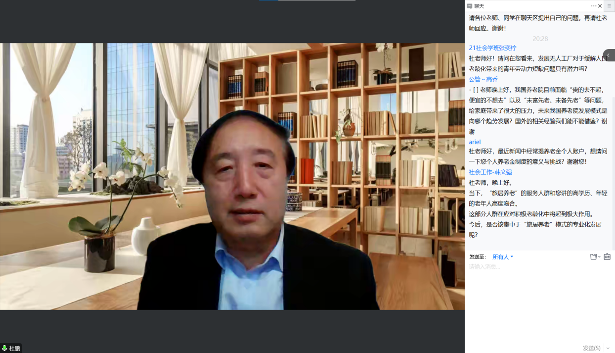最后,基于党二十大报告提出“完善社会治理体系,健全共建共治共享的社会治理制度,提升社会治理效能”的这一发展要求,杜老师从三个方面阐述了我国迫切需要将社会治理的关注点转向老龄社会新形态,以新的社会治理视野、治理理念、治理模式回应时代需求。其一,构建老龄社会治理新格局。一方面要补齐治理短板,全面推进全社会各领域治理工作,另一方面要形成与人口老龄化进程相适应的现代化治理能力与治理体系。其二,在建设社会主义现代化国家的征程中,有必要牢牢把握人口老龄化不断深入这一基本国情,加强谋篇布局,合理规划,构建各领域老龄社会治理新机制。其三,深化老龄社会治理新模式。充分发挥社会组织和老年人在社会治理中的积极性和参与度,鼓励老年人继续发挥作用;推进由政府管理向社会治理的转变,推动形成政府、社会、市场以及老年人自身及其家庭等多元主体共同参与的社会治理格局;实现全局性与整体性相结合的社会治理,老龄社会治理要关注个体发展全生命周期的前瞻性、过程性治理,老龄社会治理的发展视角需要从老龄友好向更深层次的全龄友好转变。