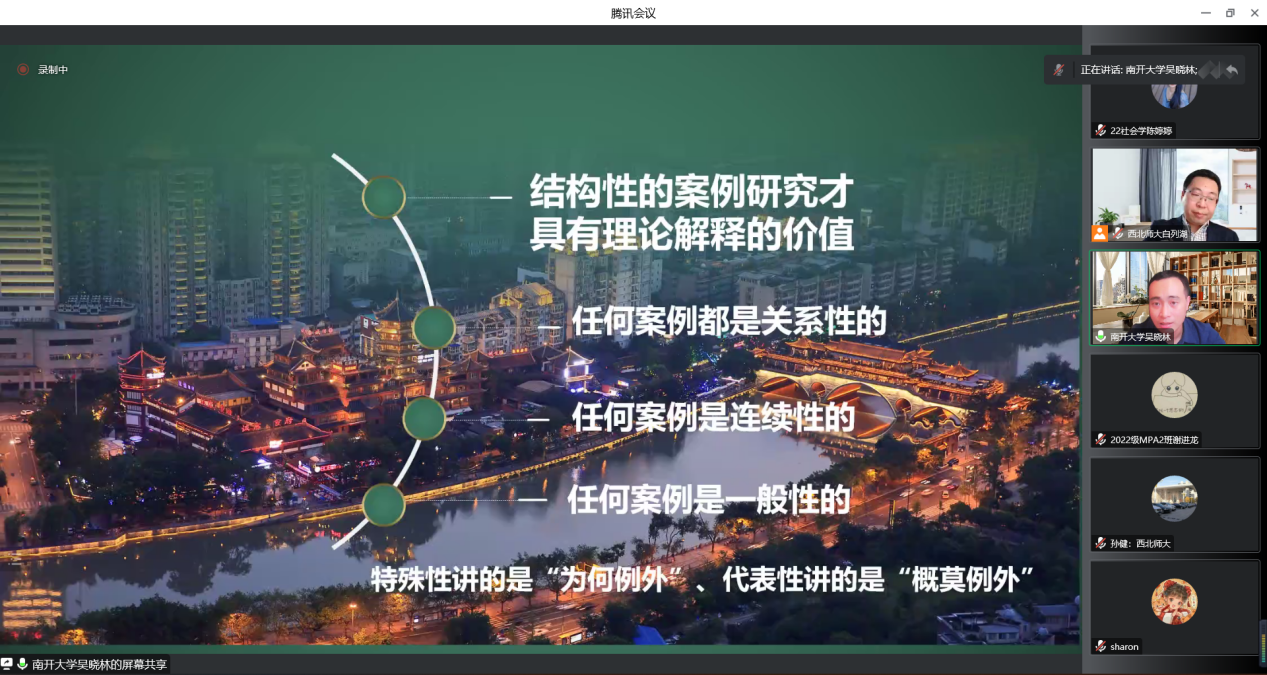 最后,立足于上述分享,吴晓林教授向与会师生分享了几点关于田野研究的心得与建议:小处着眼&结构关怀、因果探寻&结构铺排、论证丰满&有血有肉、并举例说明那些看似是一个个个案在结构和结果上毫无关系,但其背后都有关系性的、连续性和一般性,即使微观研究也离不开宏观结构层面的影响。吴晓林教授以一个“结构性的案例研究才具有理论解释的价值”的结论为此次讲座主体部分画上句号。