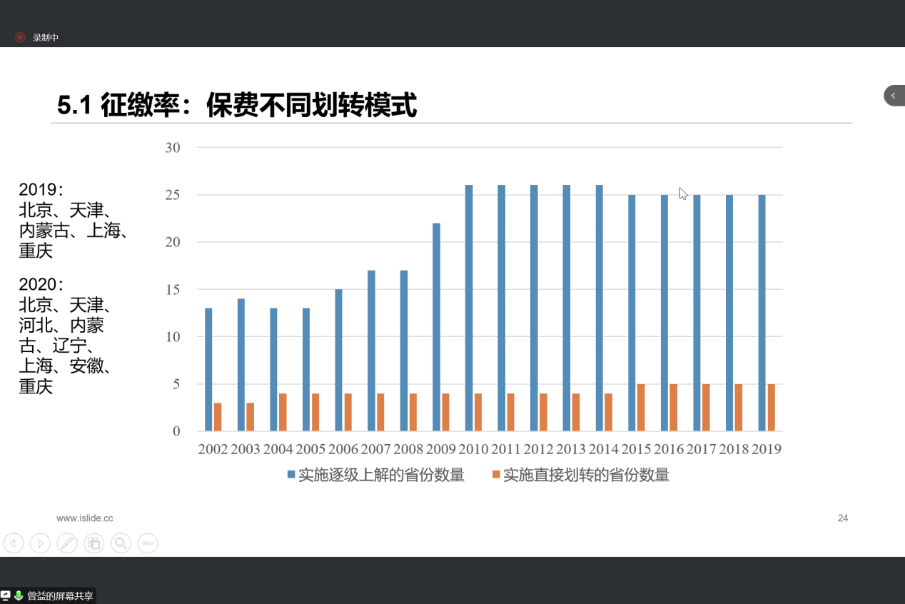 首先,曾老师从研究背景开始,指出我国目前人口老龄化程度加深,基金可持续性减弱,导致财政补贴逐年增加,自今年1月起,养老保险全国统筹已经开始实施。基于此,曾老师通过对全国各省数据资料的统计,将养老保险征缴方式划分为保费逐级上解的“L模式”和保费直接划转的“7模式”,根据两种模式的特点进一步聚焦今天讲座三个核心问题:养老保险全国统筹征缴率应设多少?如何保证基金的可持续性?如何缓解财政压力? 随后,曾老师围绕三个核心问题进行文献综述。该部分内容主要从老龄化程度加深,财政压力加重、参量改革以应对养老金支付压力、全国统筹会影响地方政府征收行为,造成征缴率降低、养老保险省级统筹经验为推进全国统筹提供了思路四个方面展开综述。第三部分内容是理论基础,研究中采用的三个理论分别是公共产品理论、基金收支平衡理论和委托代理理论,其中最重要的是委托代理理论。