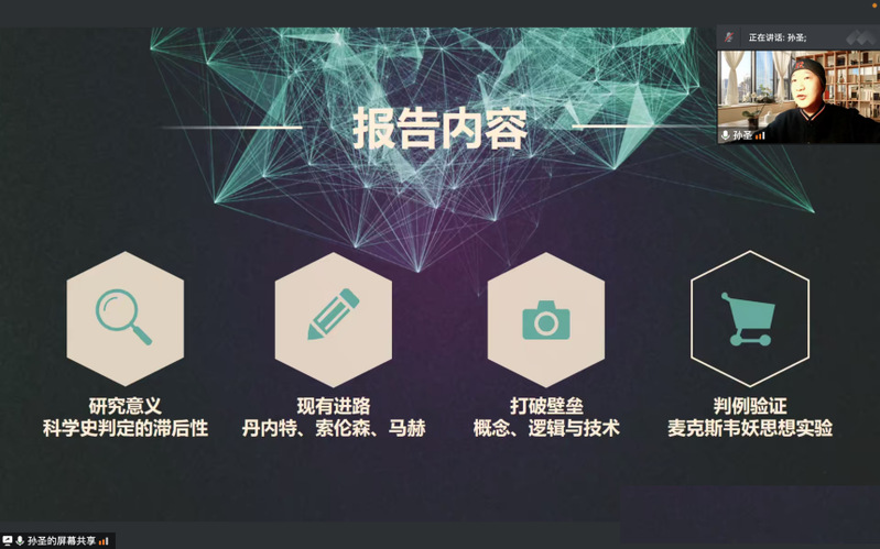 孙圣博士的报告围绕四个方面展开,一是对面临困境的分析并提出研究的意义;二是对现有的主要研究进路进行分析;三是打破现有进路的壁垒,并揭示其内在关联;四是以麦克斯韦妖思想实验为例进行判例验证。