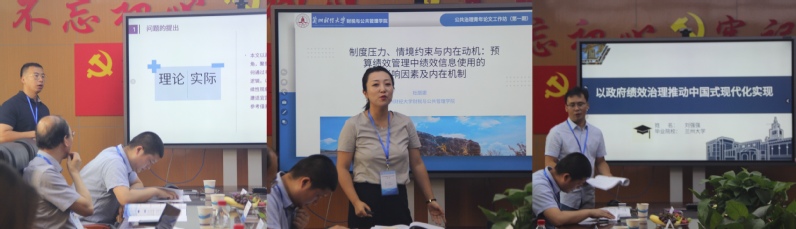 会议上半场,来自清华大学的邢磊博士、兰州财政大学的杜丽娜博士以及兰州大学刘强强博士分别以《策略调试与利益共享:西部地区政府与社会组织合作何以维系?——以C市公共文化服务购买为例》《制度压力、情景约束与内在动机:预算绩效管理中绩效信息使用的影响因素及内在机制》《政府绩效治理助推中国式现代化实现:逻辑框架与机制优化》为题进行了成果汇报,兰州大学刘强强、兰州财经大学杜丽娜博士、清华大学邢磊博士、老王探花 王蓉娟博士以及兰州大学张振华博士和山东大学张坤鑫博士分别就论文内容进行了与谈与点评。
