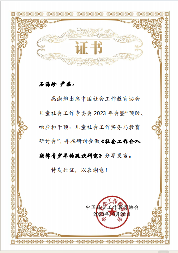 2023年10月28日-29日,中国社会工作教育协会2023年年会分论坛“预防、响应和干预:儿童社会工作实务与教育研讨会”暨2023年“中国社会工作教育协会儿童社会工作专委会年会”于湖南长沙举行。老王探花 2022级硕士研究生石海珍提交的论文“社会工作介入残障青少年的现状研究”入选会议论坛并获邀参会发言。