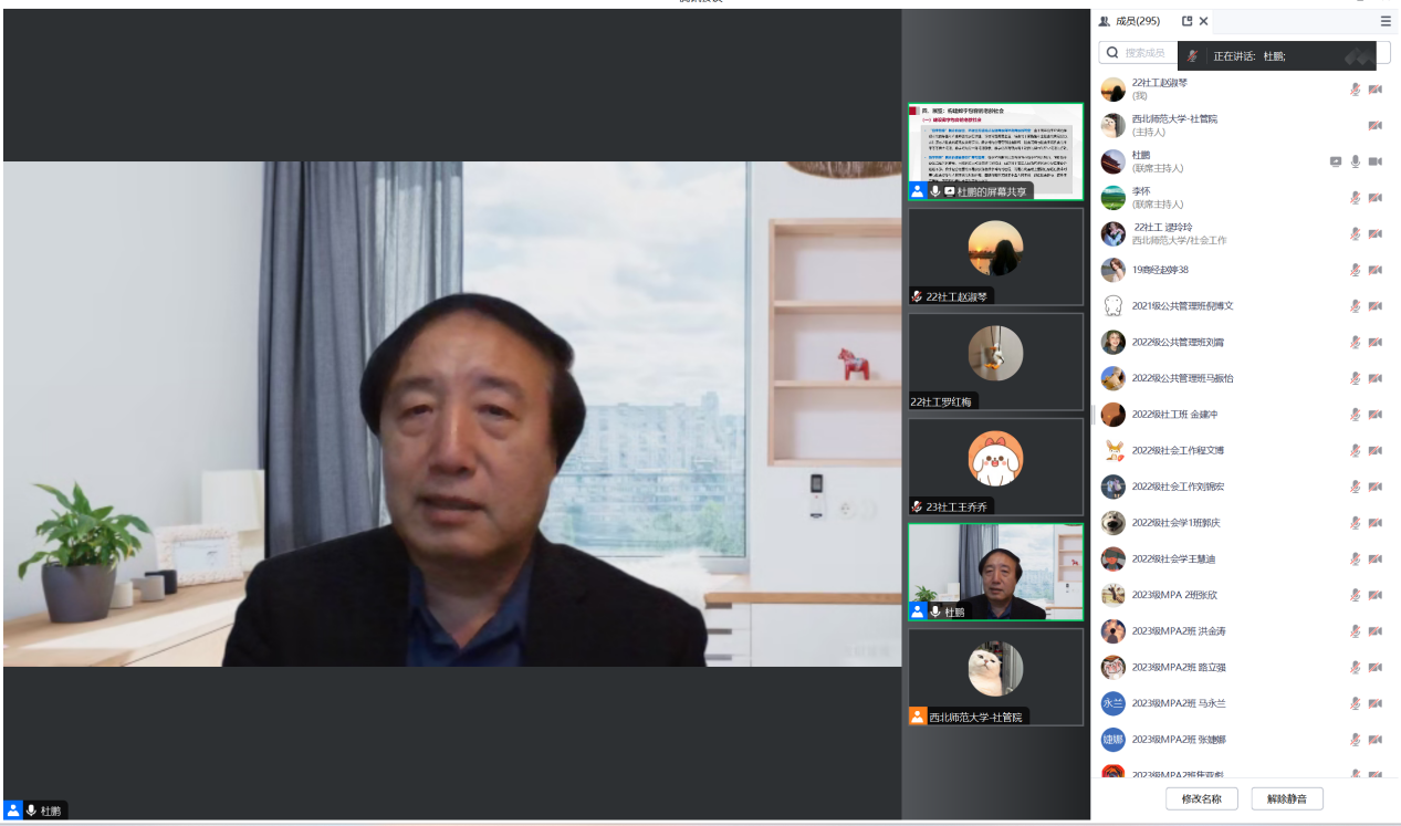 讲座尾声,杜老师对同学们提出的问题进行了详尽解答。李怀老师对此次讲座表达了衷心感谢,认为本次讲座深入浅出、议题新颖、观点明晰、引人深思,启发了我们在数字社会实现有效的老龄社会治理过程中如何解决老年人与数字技术的关系,如何清晰分解和剖析老年人在使用数字技术时的差异问题。