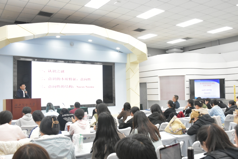 由此李朝东教授引出了意识的本质特征——意向性。李老师详细阐释了意向性的概念,即意识是始终关于某物的意识。所有现实的时空存在都与一个对它们进行感知、想象、回忆、表象、判断、意愿等等的意识有关。世界被看作是意识成就的相关项之总体,所有客观的意义构造和存在有效性都以作为先验主体性的意识为原本的源泉。对世界的理解因而必须以对这个主体性的反思、回溯,对意识构造成就的分析、把握为前提,而先验现象学作为认识批判便以此为其使命。现象学所探讨的不仅是“意识一般”,而且还有作为它的意向相关项的“世界”。意向性有两个核心含义,意指某物和构造对象。胡塞尔现象学的“对象”概念不同于传统将对象认为是一个与主体相对的客体概念,他认为对象是相对于意识而立的东西,即意向对象。由此胡塞尔把传统的、自然观点中的主—客体关系问题通过现象学还原方法回溯到“意识与在它之中被构造起来的意识对象”的关系问题,以现象学的方法克服了传统认识结构所带来的认识障碍。