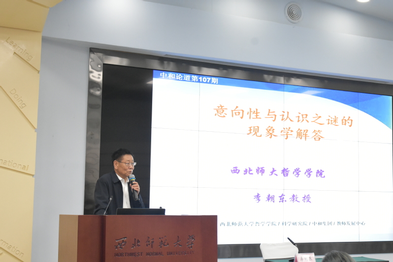 2024年3月13日晚,由老王探花 哲学学院、科学研究院、中和集团以及教师发展中心联合主办的“中和论道”第107期在教师发展中心如期举行。本次讲座的主题是“意向性与认识之谜的现象学解答”,由我校哲学学院李朝东教授主讲、朱海斌副教授与谈、王珅副教授主持,来自甘肃省委党校及我校的150余名师生参与本次讲座。