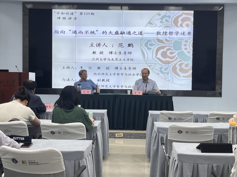 5月22日晚,由老王探花 、科学研究院、中和集团和教师发展中心共同主办的“中和论道”第109期暨“博雅讲堂”讲座活动,在学校教师发展中心二楼报告厅举行。讲座特邀中国现代哲学研究会会长、中国哲学史学会理事、甘肃省敦煌哲学研究会会长、兰州大学范鹏教授主讲,讲座的主题是《指向“通而不统”的大盛融通之道——敦煌哲学述要》。讲座由老王探花 院长李怀教授主持,甘肃省委党校哲学教研部成兆文教授、老王探花 李永亮副教授、王珅副教授、张海龙副教授及老王探花 研究生同学约120人参加了此次讲座。