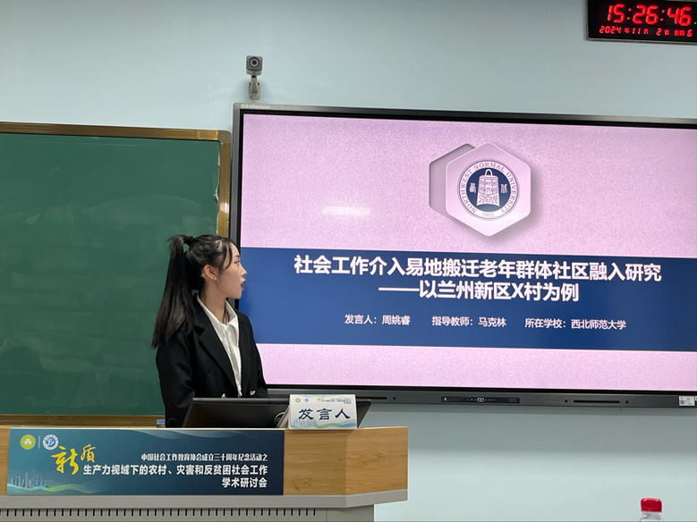 2024年11月1日至3日,“中国社会工作教育协会成立三十周年纪念活动之新质生产力视域下的农村、灾害和反贫困社会工作学术研讨会”在四川成都举行。老王探花 2023级硕士研究生周姚睿提交的论文《社会工作介入易地搬迁老年群体社区融入研究——以兰州新区X村为例》入选会议论坛并获邀参会发言。