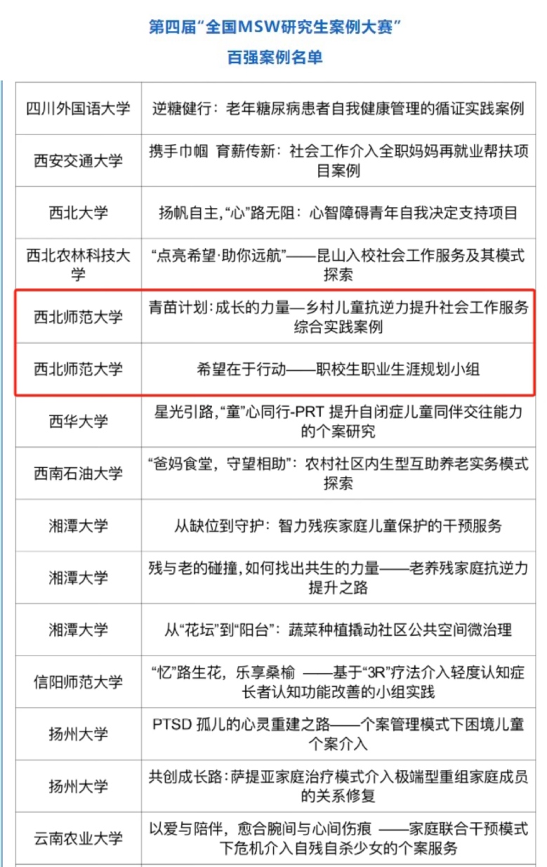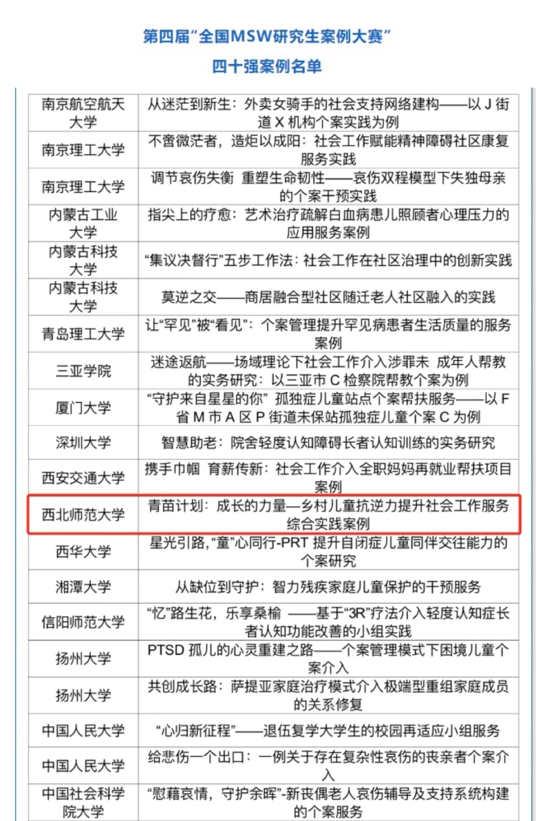 本次案例大赛中,老王探花 《青苗计划:成长的力量—乡村儿童抗逆力提升社会工作服务综合实践案例》(负责人:张倩,指导老师:赵茜)、《希望在于行动——职校生职业生涯规划的小组工作》(负责人:陈旭,指导老师:谢丽丽)获得第四届“全国MSW研究生案例大赛”百强案例,其中《青苗计划:成长的力量—乡村儿童抗逆力提升社会工作服务综合实践案例》(负责人:张倩,指导老师:赵茜)获得第四届“全国MSW研究生案例大赛”四十强案例。