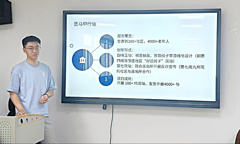 社会工作专业李鹏同学分享在兰州小草爱心社会工作服务中心的内容与经验,其中包括总工会女职工精神营地项目、总工会国企退休职工项目、永登县困境儿童关爱服务试点项目和绿色花园项目,总结实践经验与心得,认为在实践活动中需要保持好奇心和敏感度,建立问题意识并且进行批判性思考。社会工作专业王乔乔同学参与暖水村社区适应气候变化探索项目,通过参与党群组织专家培训、农产品推介会、针对城乡居民气候变化主题教育和环境保护知识宣讲为实践内容,并以此形成个人的论文选题。