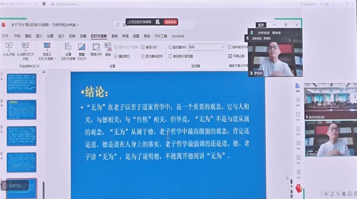 妄为;“无为而无不为”中,“无不为”是“无为”自然带来的结果,而非预先谋划的目的,将其曲解为“阴谋”是混淆了结果与目的;“无为而无以为”作为最高境界,指无任何功利动机、纯粹自然的行为,如同拾金不昧却毫无私心般,是“上德”的核心体现。再者,教授梳理“自然”与“无为”的逻辑关联,提出“自然”是老子哲学的最高范畴,高于“无为”——“上德无为而无以为”本质是“自然”的体现,完全出于本心、不附加条件;“下德无为而有以为”则是有意识的“为无为”,仍属“德”的范畴;道与“自然”关乎天地万物,德与“无为”仅适用于人,构成“自然之道—无为之德”的对应关系。最后,教授总结强调,“无为”是老子哲学中关乎人之德性的重要概念,核心是摒弃刻意妄为与功利算计,它从属于德,而德是道在人身上的落实,唯有立足道与德的整体框架,才能真正把握“无为”超越功利、回归自然的内涵。