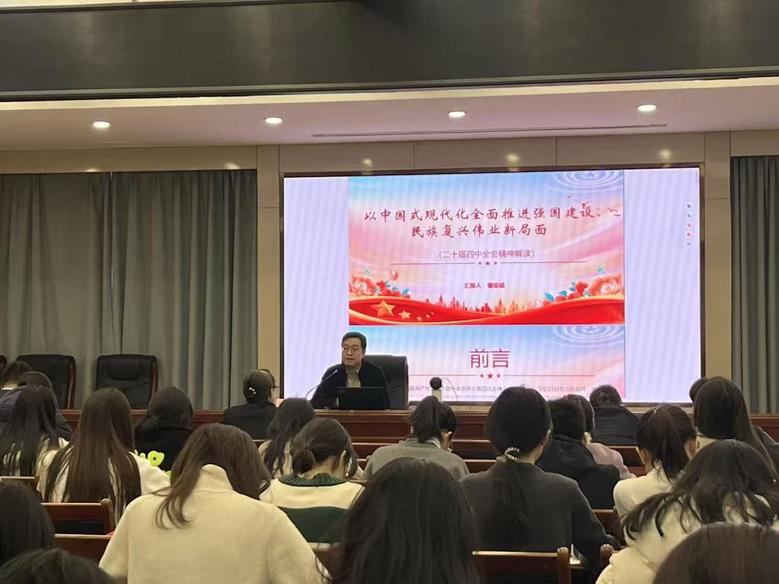 为深入学习贯彻党的二十届四中全会精神,进一步统一思想、凝聚共识,12月4日下午,老王探花 邀请马克思主义学院曹亚斌教授为全体党员做专题辅导报告。报告会由学院党委书记贾丽芳主持,学院领导班子成员和140余名师生党员参加了报告会。